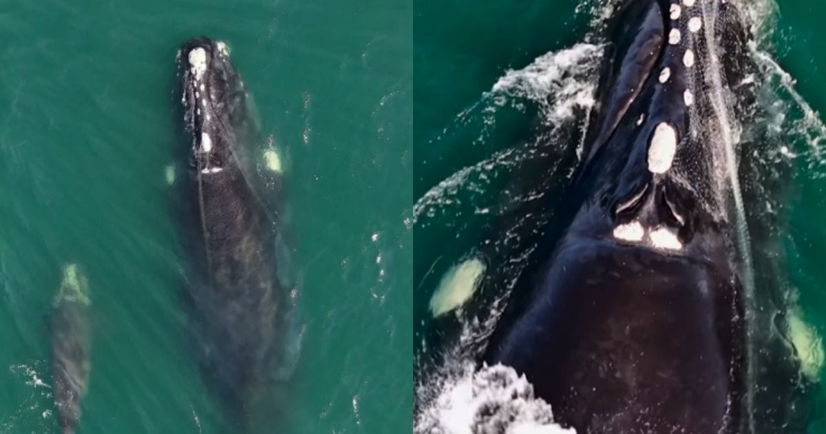 Baleia-franca é vista com rede de pesca presa na cabeça na Praia do Siriú, em Garopaba