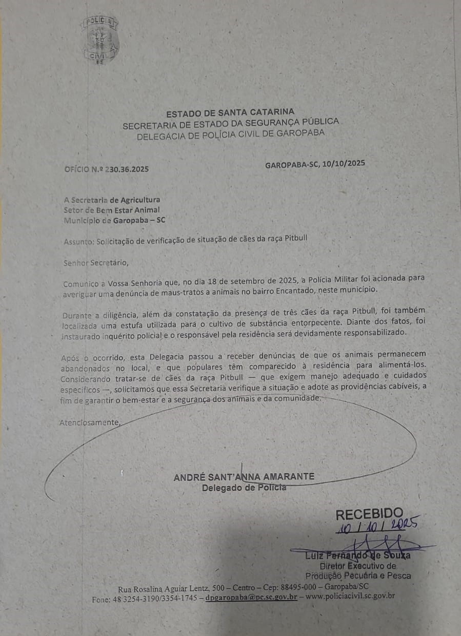Em ofício datado de 10 de outubro (sexta-feira), o delegado André Sant’Anna Amarante havia solicitado providências à Secretaria de Agricultura de Garopaba após receber denúncias de que os animais permaneciam sem cuidados adequados no imóvel. O documento informava que os cães — da raça pitbull — estavam sendo alimentados por moradores da região e solicitava que o setor de Bem-Estar Animal avaliasse a situação e adotasse medidas cabíveis.