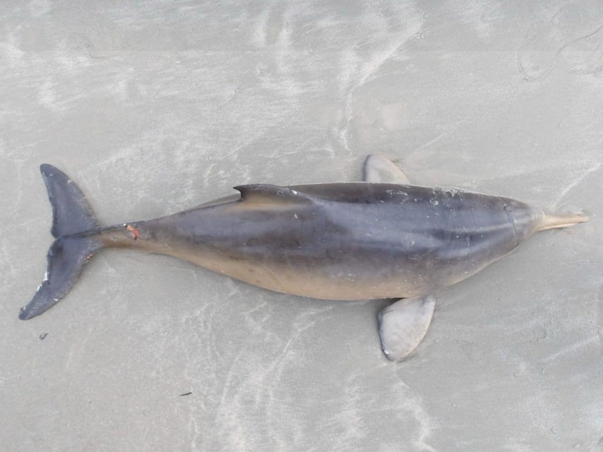 De acordo com a equipe do Trecho 2 do Projeto de Monitoramento de Praias da Bacia de Santos (PMP-BS), o animal possuía uma marca circular próxima ao olho, característica associada a redes de pesca. Assim que identificado, o golfinho foi registrado e recolhido ainda no local.