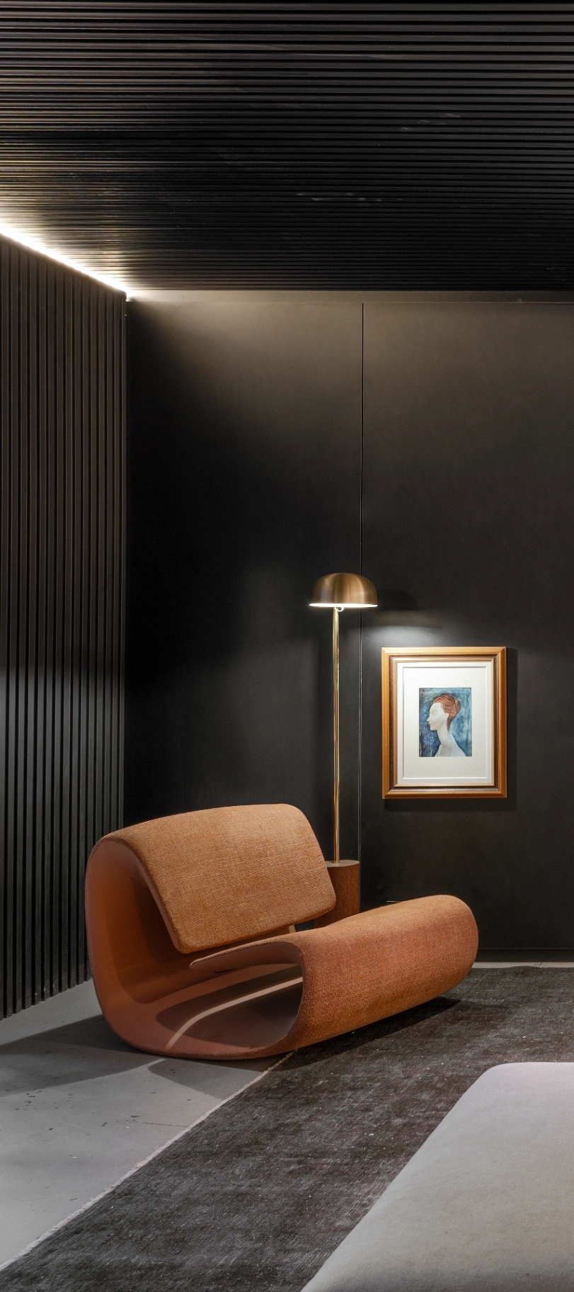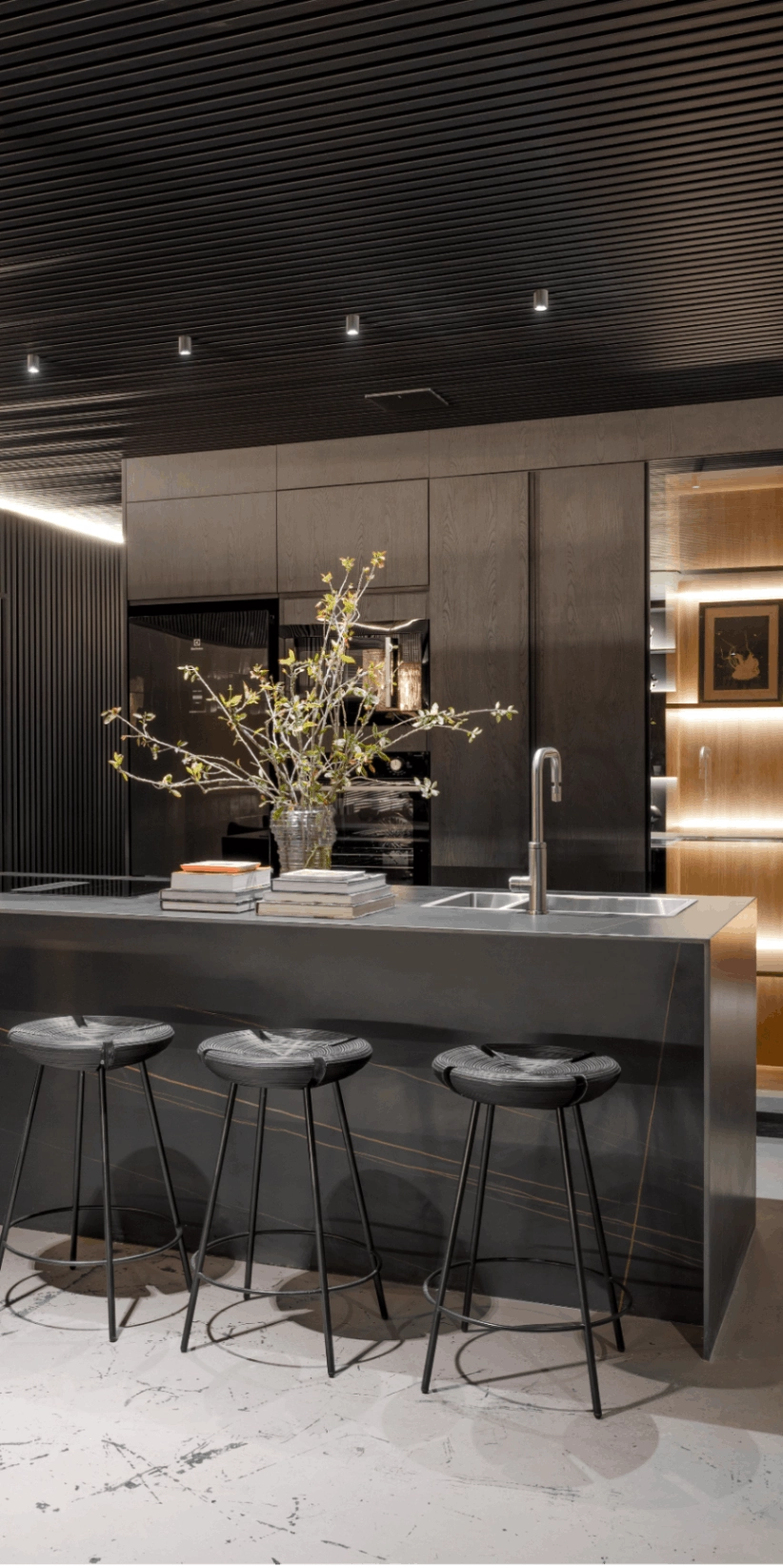 As peças integram a narrativa estética proposta, dialogando com as superfícies escuras e a iluminação indireta. Segundo Katiane, o objetivo foi criar um espaço em que a arte não compete, mas ressoa no ambiente.