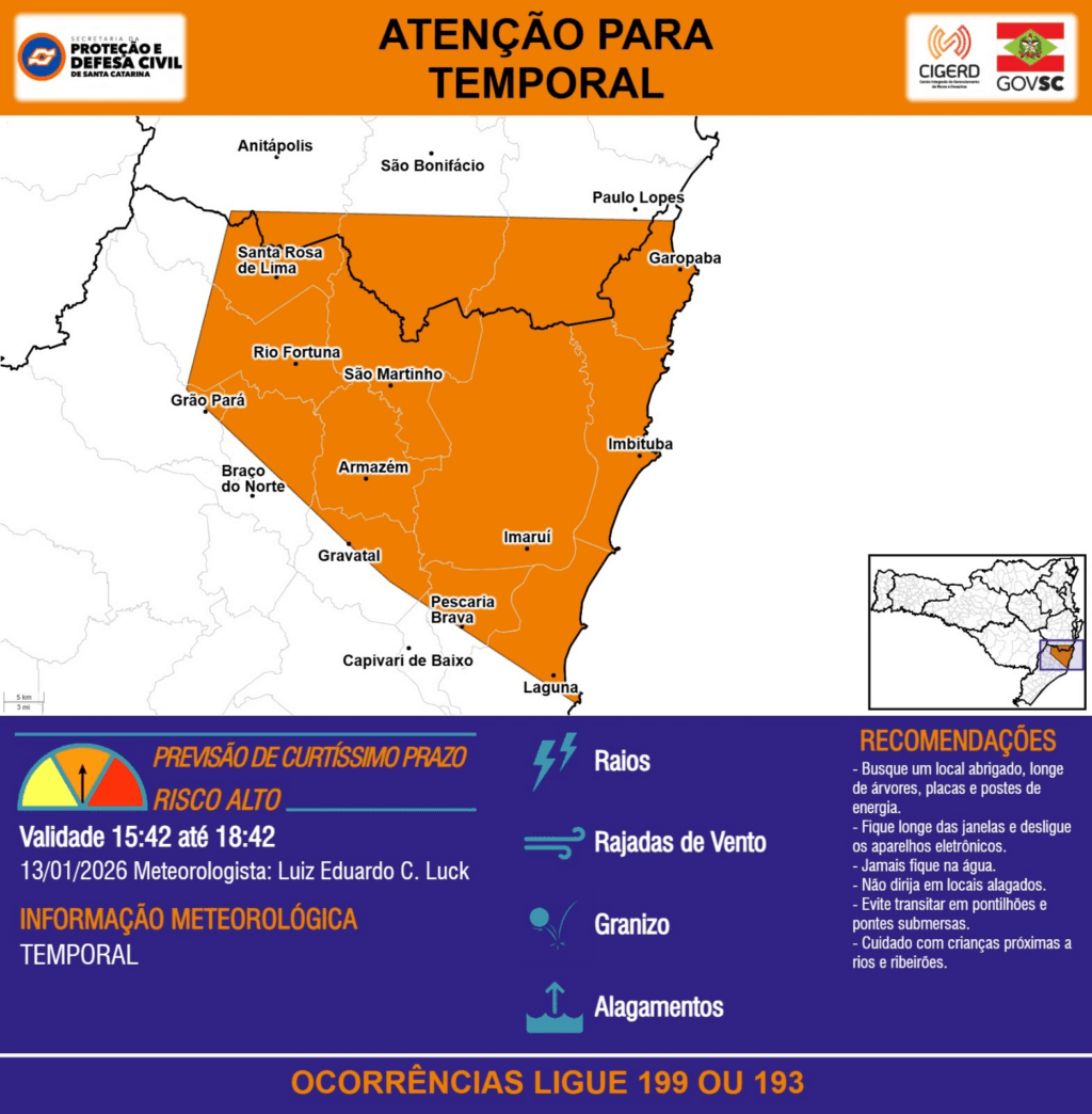 Poucos minutos depois, às 15h42, um segundo alerta foi emitido com abrangência maior e duração estimada de até três horas. De acordo com o órgão, o aviso incluiu Armazém, Braço do Norte, Capivari de Baixo, Garopaba, Gravatal, Grão Pará, Imaruí, Imbituba, Laguna, Pescaria Brava, Rio Fortuna, Santa Rosa de Lima e São Martinho.