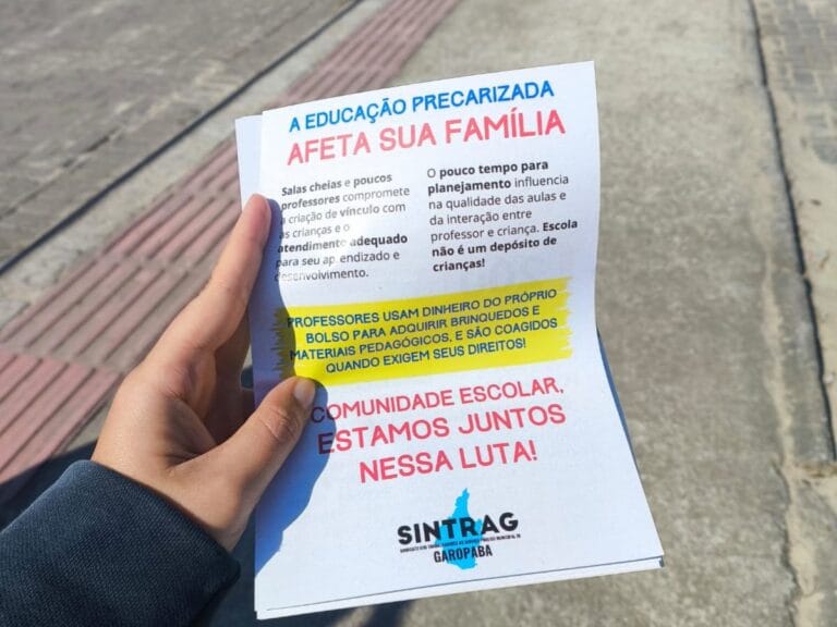 O Sindicato dos Trabalhadores no Serviço Público Municipal de Garopaba (Sintrag) deu início nesta terça-feira (8) a uma panfletagem para alertar sobre a atual situação da educação no município. A ação foi definida em assembleia com o magistério municipal realizada no dia 26 de maio de 2025 e tem como objetivo chamar a atenção da comunidade escolar para os problemas enfrentados por profissionais da rede pública.