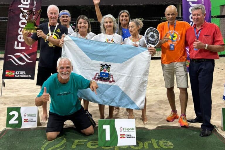 Garopaba alcançou um resultado inédito no esporte neste fim de semana, durante a etapa estadual dos Jogos Abertos da Terceira Idade (JASTI), realizada em Joinville. A equipe feminina conquistou o título no Beach Tennis pela primeira vez, após uma campanha invicta e sem perder sets ao longo da competição.