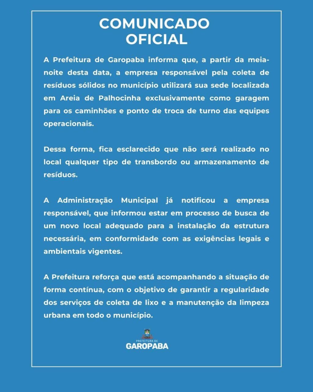 A Prefeitura de Garopaba publicou, na noite de sexta-feira (10), um comunicado oficial em seu perfil nas redes sociais informando mudanças na operação da empresa Moraes Locação de Equipamentos Ltda., responsável pela coleta de resíduos sólidos no município.