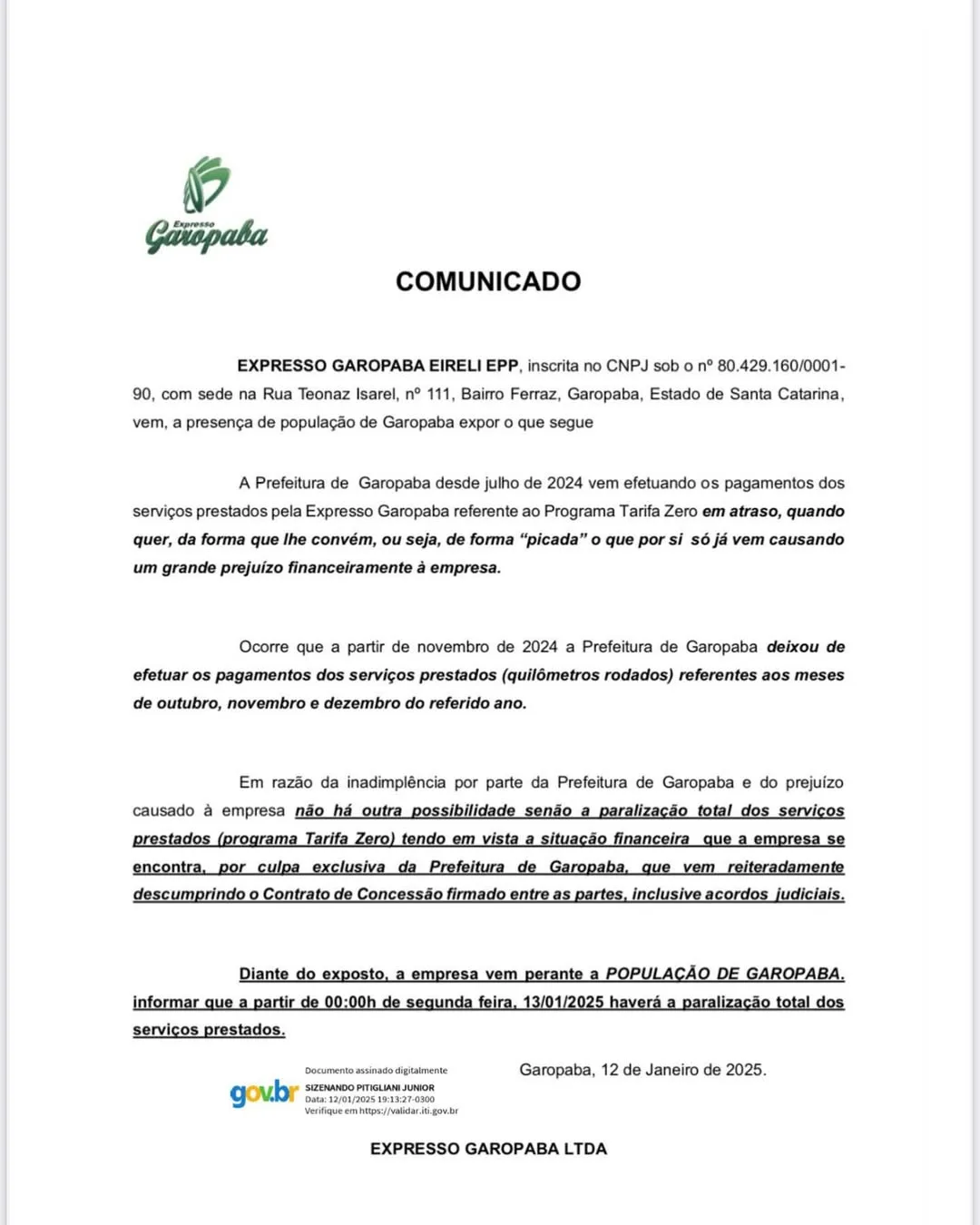 O ofício ressaltou que os pagamentos, que deveriam ocorrer até o dia 10 do mês subsequente à prestação do serviço, estavam sendo realizados de forma parcelada desde junho de 2024. A empresa alertou que a situação financeira havia chegado a um ponto crítico devido à falta de repasses, agravada pelos valores acumulados dos últimos meses de 2024. A Expresso Garopaba também afirmou ter protocolado diversas notificações junto à administração municipal, sem resposta efetiva.