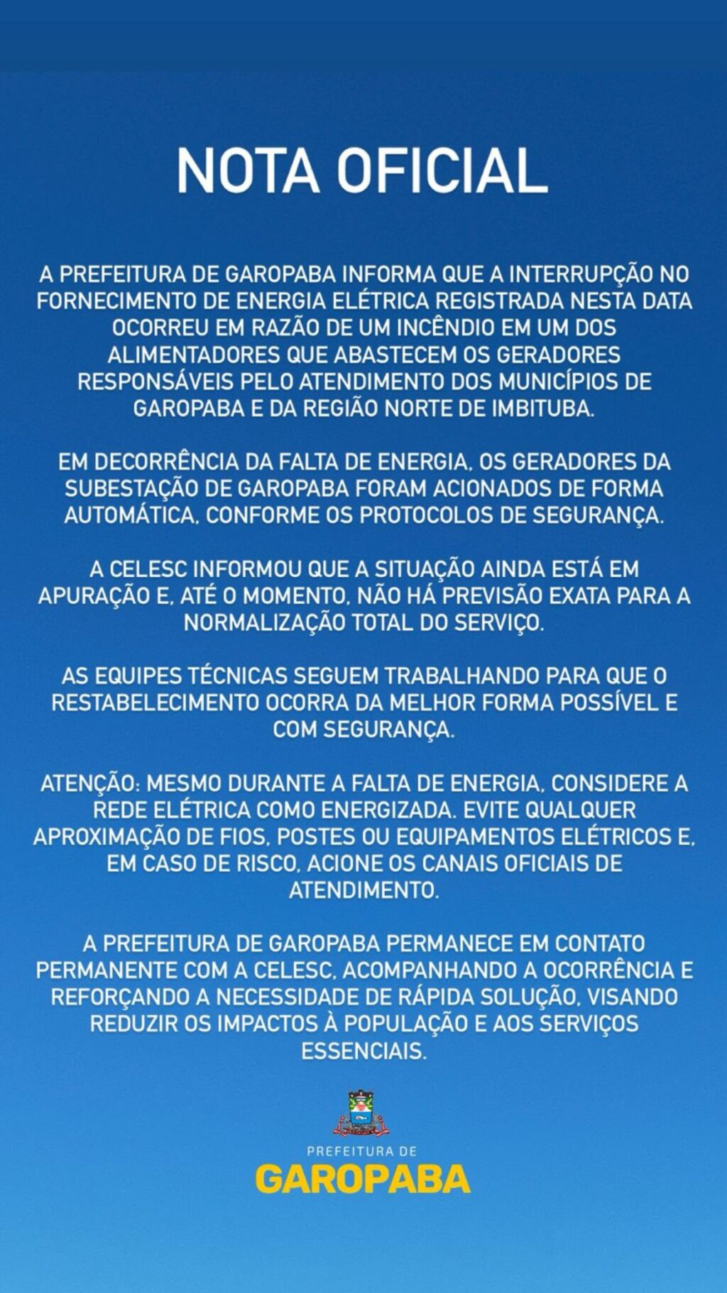 Após a sequência de quedas registrada na noite desta sexta-feira (2), a Prefeitura de Garopaba divulgou uma nota oficial informando que a interrupção ocorreu em razão de um incêndio em um dos alimentadores que abastecem os geradores responsáveis pelo atendimento de Garopaba e da região norte de Imbituba.
