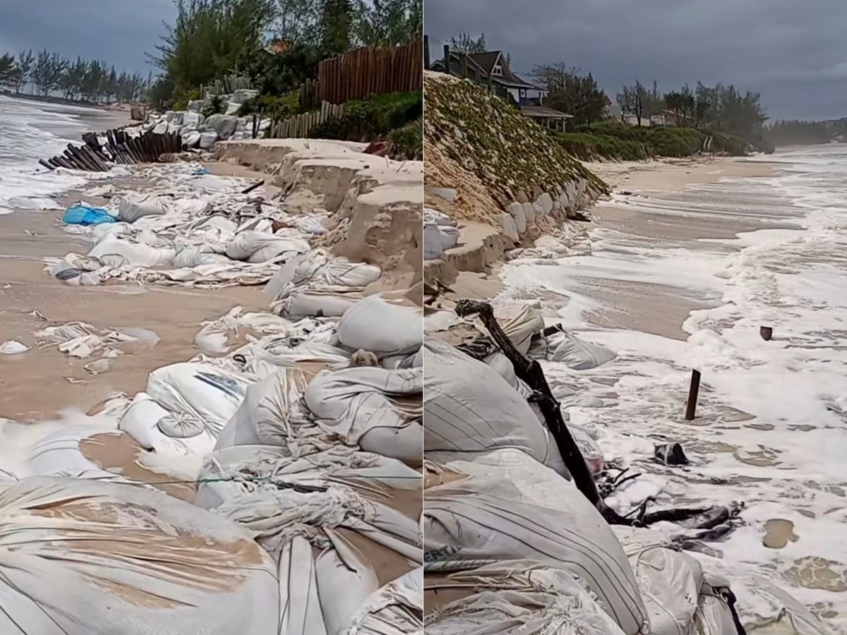 Os sacos danificados estavam posicionados ao lado das novas estruturas instaladas em meados de outubro, que seguem no local. Nessa área, a força das ondas removeu parte da areia que cobria os sacos mais recentes, deixando parte do material exposto.