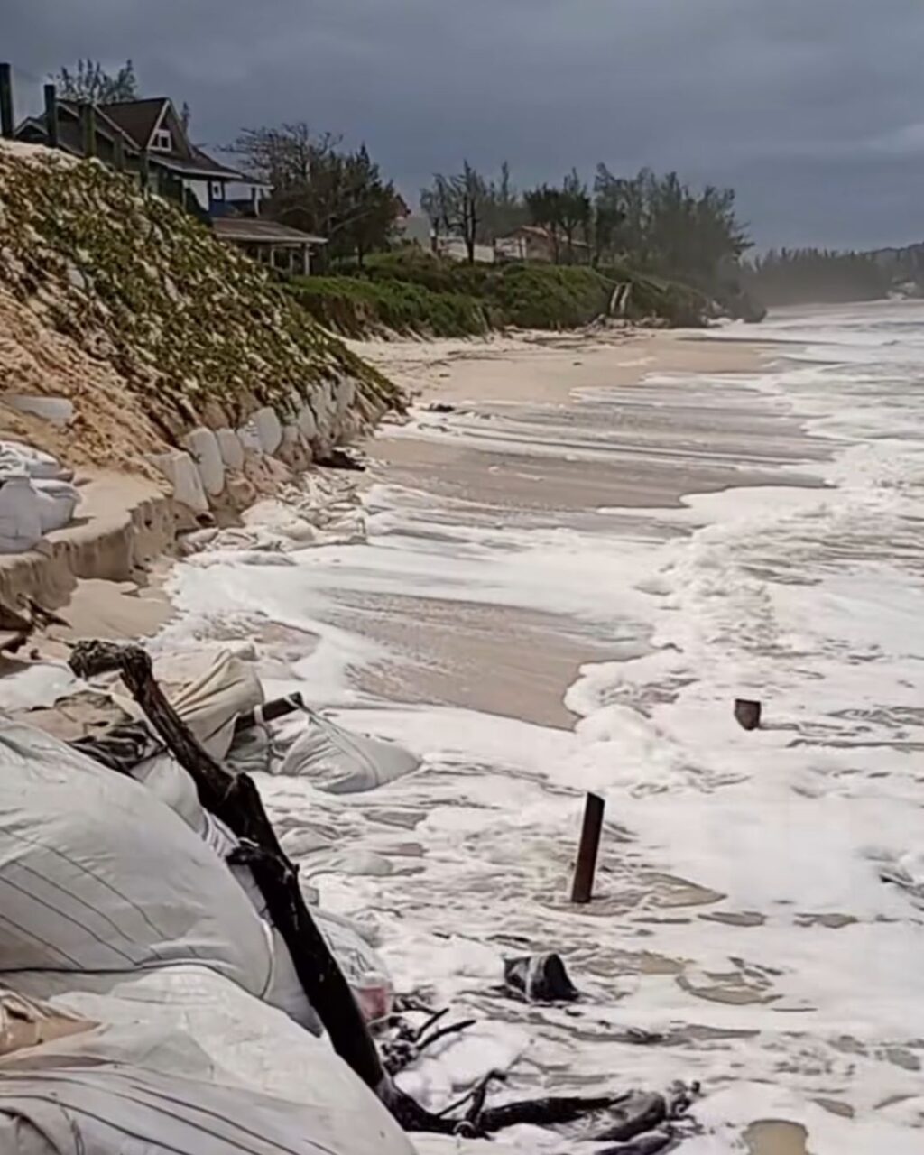 Um vídeo gravado por um morador nesta quinta-feira (30) mostra o estado da Praia da Barra, em Garopaba, após a força das ondas do mar que atingiu o local. As imagens revelam sacos de areia (bags) instalados em período anterior rasgados e deslocados, com fragmentos de material espalhados pela faixa de areia e no mar, transformando parte da estrutura em resíduo plástico.