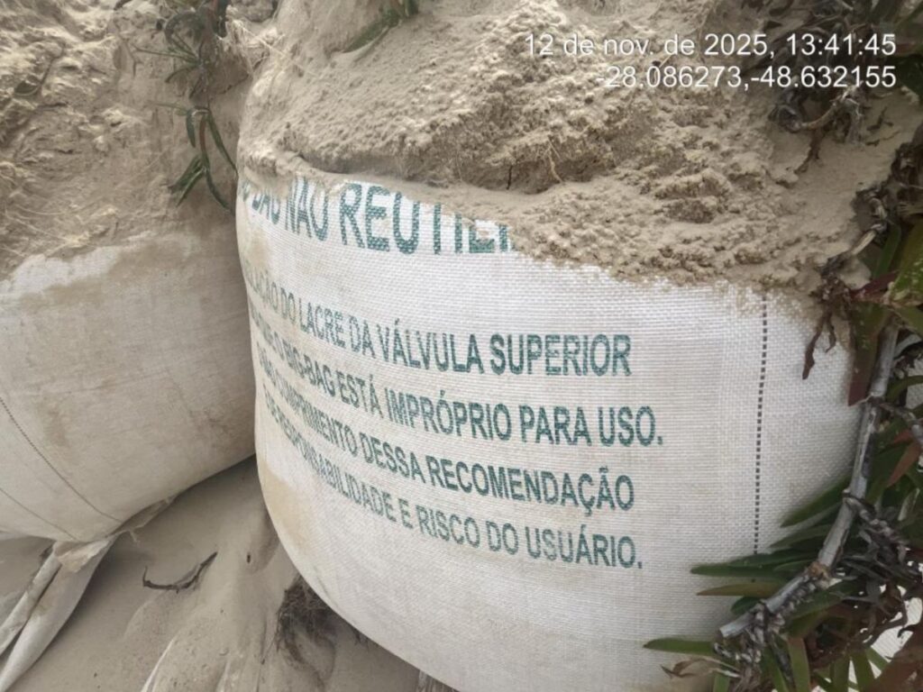 Também foram identificados sacos com inscrições relativas ao uso para fertilizantes e produtos químicos, indicando que não são reutilizáveis. O IMA registrou ainda o uso de espécies exóticas para recomposição de taludes, como Carpobrotus acinaciformis e Casuarina sp., prática que não é permitida em dunas frontais, classificadas como Áreas de Preservação Permanente (APPs).