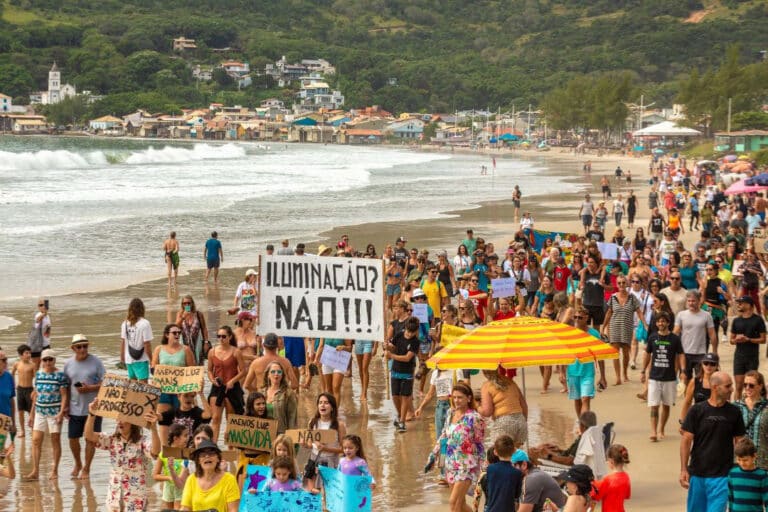 Na manhã deste sábado (11), moradores, frequentadores e apoiadores de causas ambientais se reuniram na Praia Central de Garopaba para um protesto contra a instalação de iluminação pública na faixa de areia. O ato ocorreu na entrada principal da praia, na Avenida dos Pescadores, e reuniu cerca de 160 participantes.