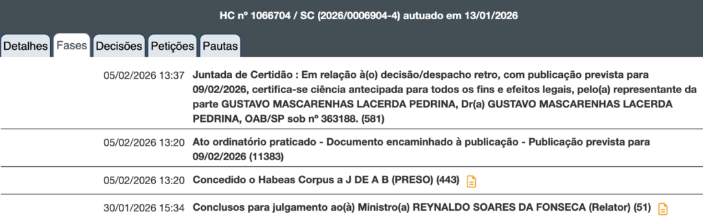 Junior de Abreu Bento havia sido preso em 8 de janeiro, durante a segunda fase da operação Coleta Seletiva, e estava detido no Presídio Regional de Tubarão. Com a decisão do STJ, caberá ao juízo de origem cumprir a ordem de soltura, podendo, eventualmente, impor medidas cautelares alternativas previstas na legislação.