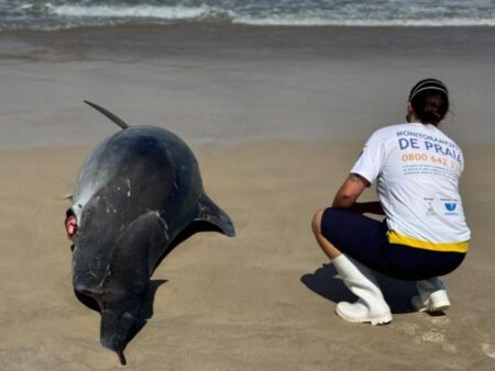 Animal da espécie boto-de-Lahille foi localizado sem vida no sábado (7) e encaminhado para análise; gestação foi confirmada após exames.