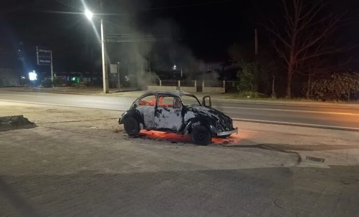 Fusca pega fogo na SC-434 em Garopaba e ocupantes fogem do local antes do socorro